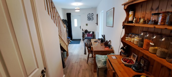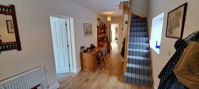 Large entrance hallway with a knee-hole desk & chair, dresser & downstairs WC.