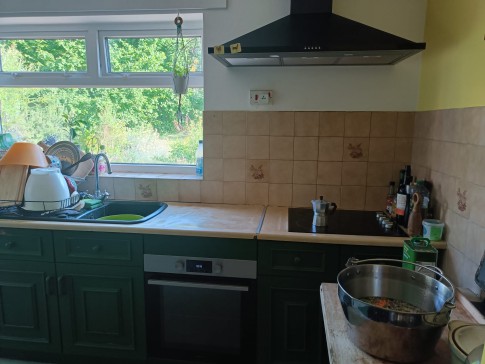 There is an electric fan oven and electric 4-ring hob in the kitchen. Toaster, kettle. No microwave. Adjacent utility room has fridge freezer, dishwasher, washing machine, iron and ironing board.