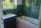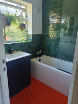 Recently refitted downstairs bathroom with basin and shower over the bath.