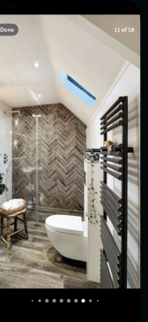 The modern bathroom has walk in shower, toilet and twin wash basins.
