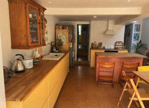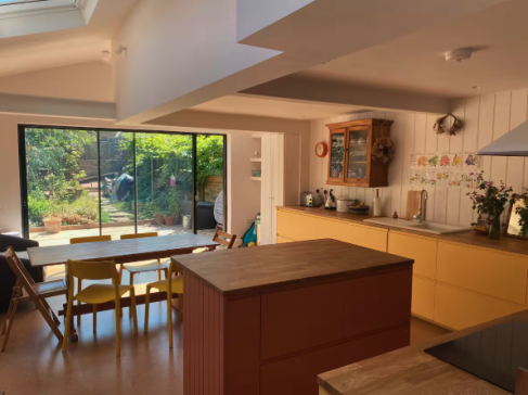 - The kitchen-diner is fully equipped and has a bright and sunny aspect in the mornings. The kitchen opens onto decking leading to a quiet and peaceful garden. The kitchen has been fully extended and is now with velux window and full width sliding glass doors onto the garden, as well as a kitchen island and small sofa.