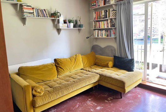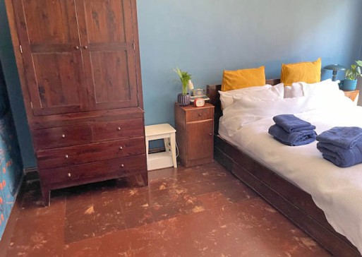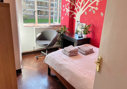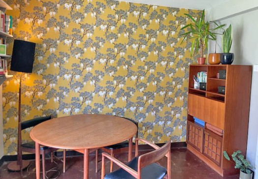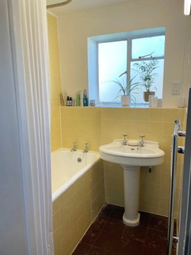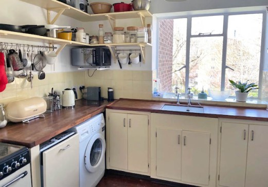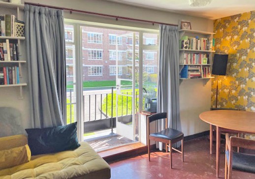 The flat sits on the first floor. It has a living room with a balcony overlooking mature trees and landscaped shared gardens. Inside, each room has been thoughtfully decorated in a mid-century style. There is original tiled flooring throughout. The main bedroom is light and spacious and has a king-sized bed. The second bedroom has a small double and is a cosy children`s room.