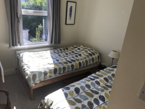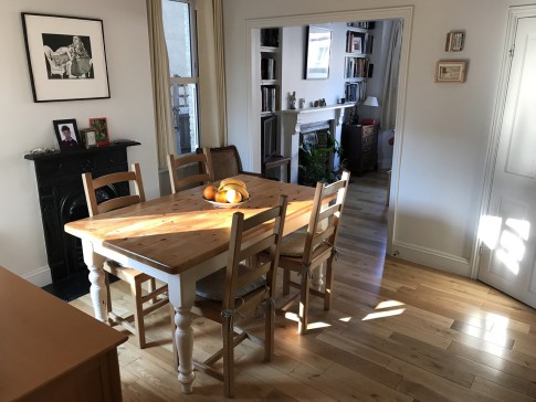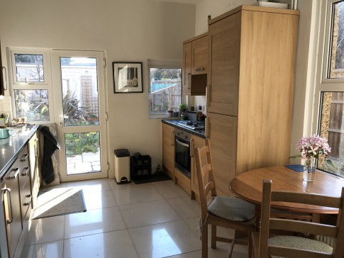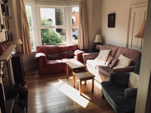 We live in a semi-detached house dating from about 1910. There are three double bedrooms, a bath/shower room/toilet and a second toilet downstairs. The front living room and dining area are open plan; the kitchen is well equipped with a washing machine and dishwasher and small table. There is gas central heating.