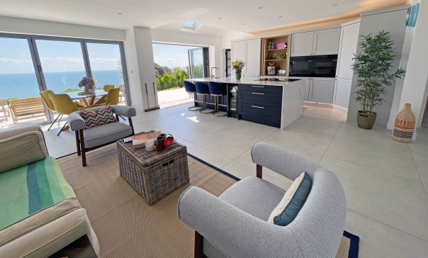 The main living spaces are open-plan kitchen/dining/living area filled with natural light, thanks to three sets of bi-folding doors and a thoughtfully designed architectural layout. This central space seamlessly connects with the outdoors and takes full advantage of the sea views.