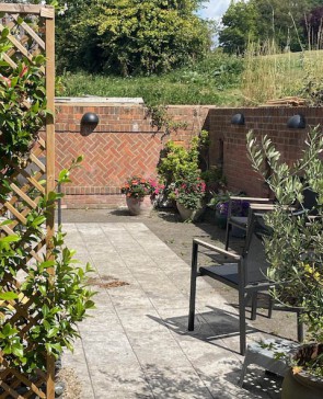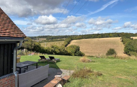 There are patios both back and front of the house with ample garden furniture. The house is in an elevated position and has good views down the Chess Valley.