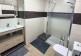 The bathroom with a modern shower cabin, a toilet, a sink and a wash basin with storage and a hairdryer.
